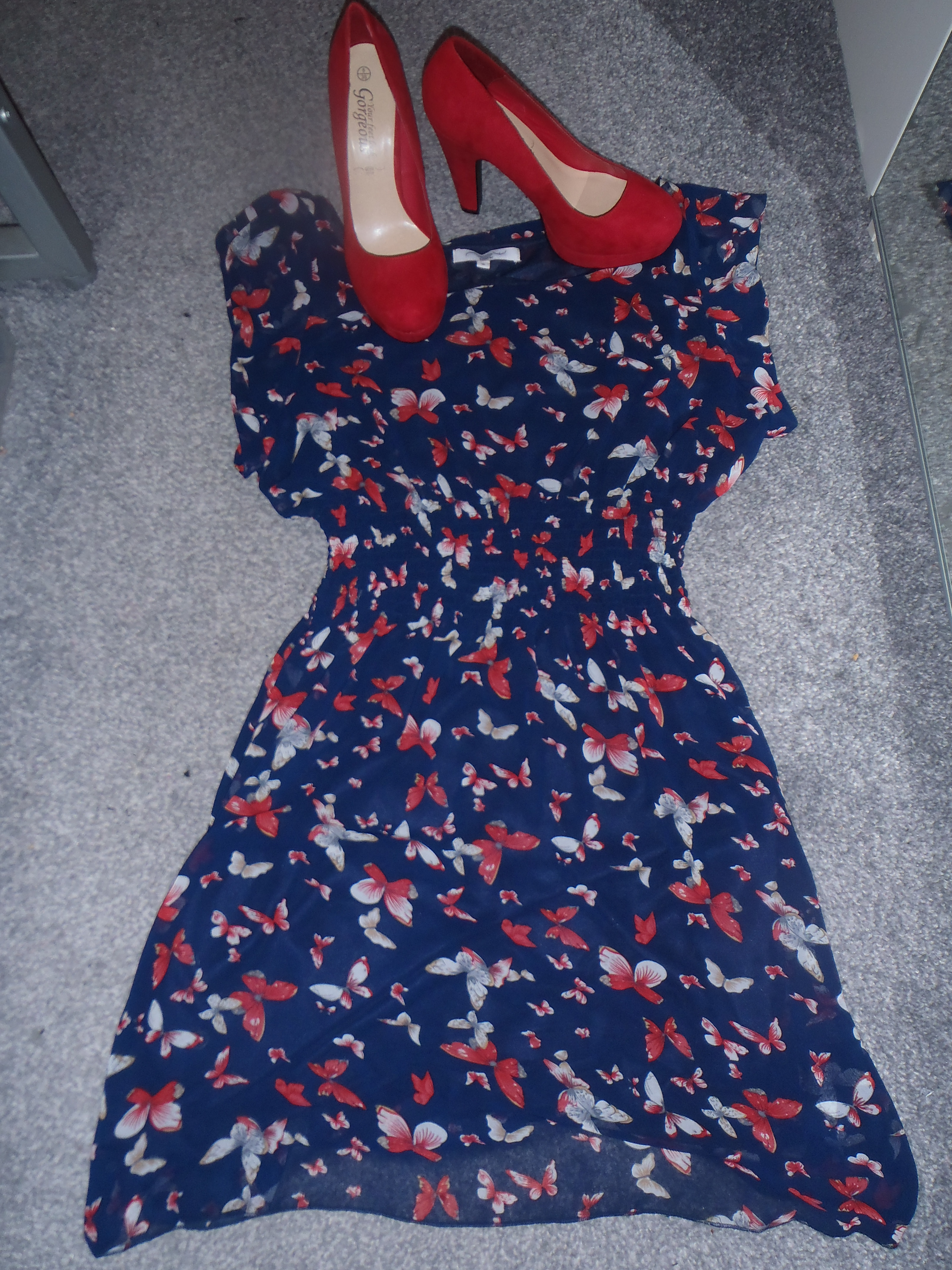 Early December saw my friend’s baby boy christened. He wore a beautiful gown that was a family heirloom. I always think choosing an outfit as a guest at a christening can be difficult. It sort of requires a dressed down, wedding attire look with an avoidance of black, being that it is a joyous occasion. This is fine in the summer but being winter and tights being required made it more difficult. In the end I opted for this navy dress with butterflies and red cardigan and shoes, all from New Look.