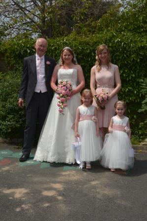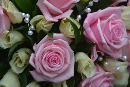 My maid of honour wore a Coast baby pink dress whilst my 2 flower girls (my nieces) wore Ivory dresses with a pink sash from Demigella and pink satin shoes from Marks and Spencer. Their look was finished off with a tiara each from Accessorize and a basket with ‘happily ever after’ on it and filled with pink and cream rose petals. Along with the rose petals, the florist also delivered a tear drop bouquet of pink roses and white lithianthus’, studded with pearls for me and a slightly smaller matching bouquet for my maid of honour. All the flowers were paid for out of my paternal grandmother’s inheritance as a tribute to her, being that her passion was gardening.