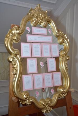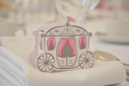 People found their seats on the table plan which I made from a mirror shaped like a fairytale mirror in Snow White. The Toastmaster then announced our arrival to the wedding breakfast as the newest Mr and Mrs Thompson. The tables had been set out more beautifully than I had dared to imagine. Each table had a tall martini glass filled with flowers and crystals draped around it. Every chair had a white cover and a baby pink bow around it courtesy of Ambiance. Each table was named something fairytale related with the top table being ‘Happily Ever After’ of course. Place cards matched the invitations and order of services with a prince and princess on, purchased from Confetti. Each person had a carriage shaped box as a favour which was filled with 5 pink sugared almonds and a note to explain the significance of them. For those who don’t know, they stand for health, wealth, happiness, long life and fertility. The meal was delicious thanks to A Form Catering with portions sizes which left no one feeling hungry. The meal was followed by speeches. My Dad, the best man and my husband all gave wonderful speeches especially given that they are all quite shy. I was truly touched by all of them.