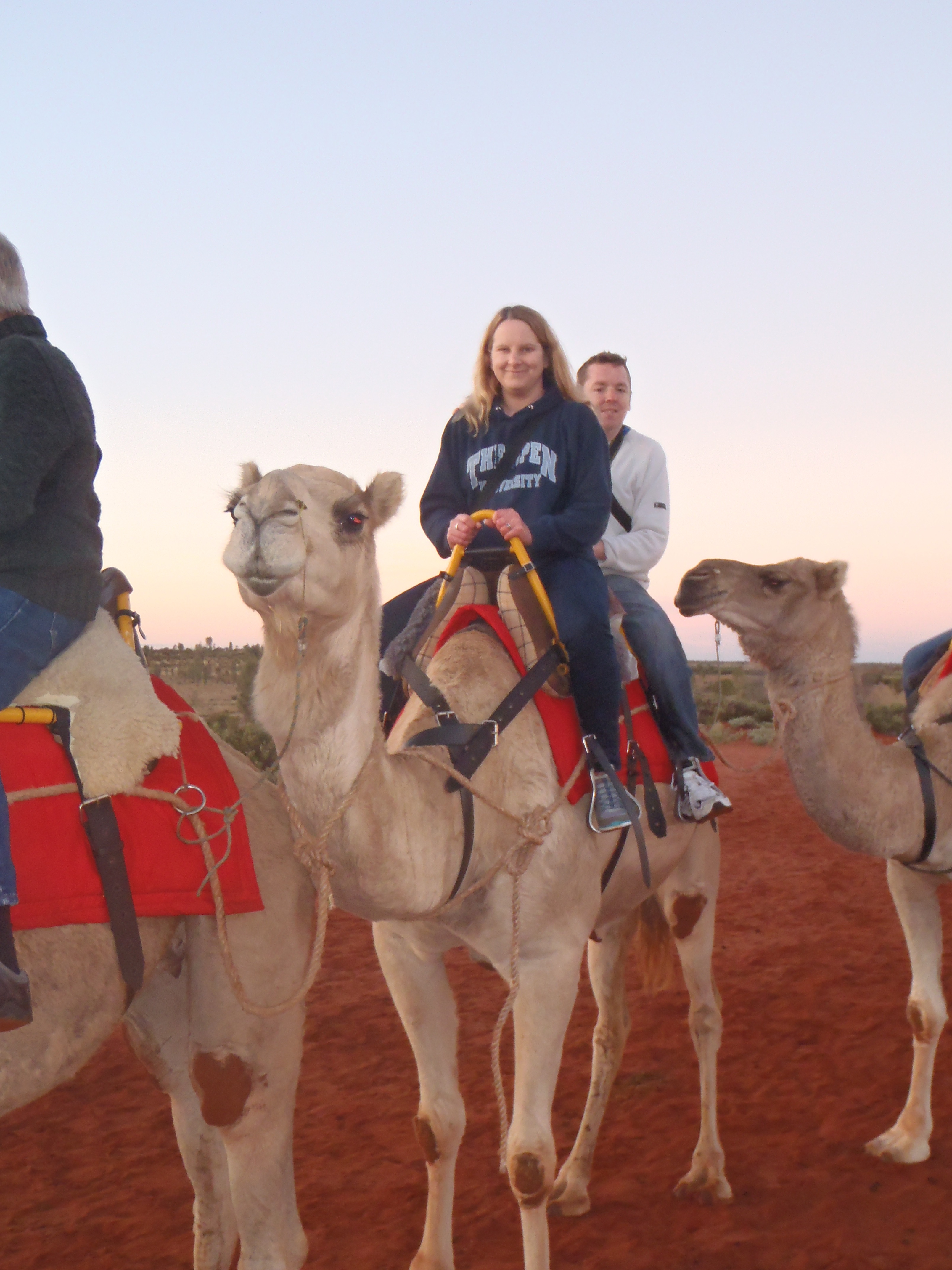 From Sydney our next stop was Ayres Rock where we were given a bottle of champagne on arrival to celebrate our marriage. The temperature was very high and it was a dry heat with lots of pesky flies. Our first site of Ayres Rock or (Uluru as the aborigines call it) and the lesser known Kata Tjuta came on a morning camel hike. Each time I go on a camel it doesn’t get anymore comfortable but it was beautiful to see the sunrise over the rock whilst travelling a traditional way and our camel was a cutie called Muriel. When we returned from the ride we were given traditional billy tea (tea made in a billy can and baked beer bread (damper) with quandong jam (outback native fruit). The billy symbolises the spirit of exploration of the outback. Seeing the rock change colour with the sun was truly remarkable. The rock is sacred to the aboriginories and the stories that go with it are truly awe inspiring as are the bits of original artwork that remain on it in places. Whilst at the resort we also did a sunset trip out to the rocks and enjoyed champagne as the sun went down.