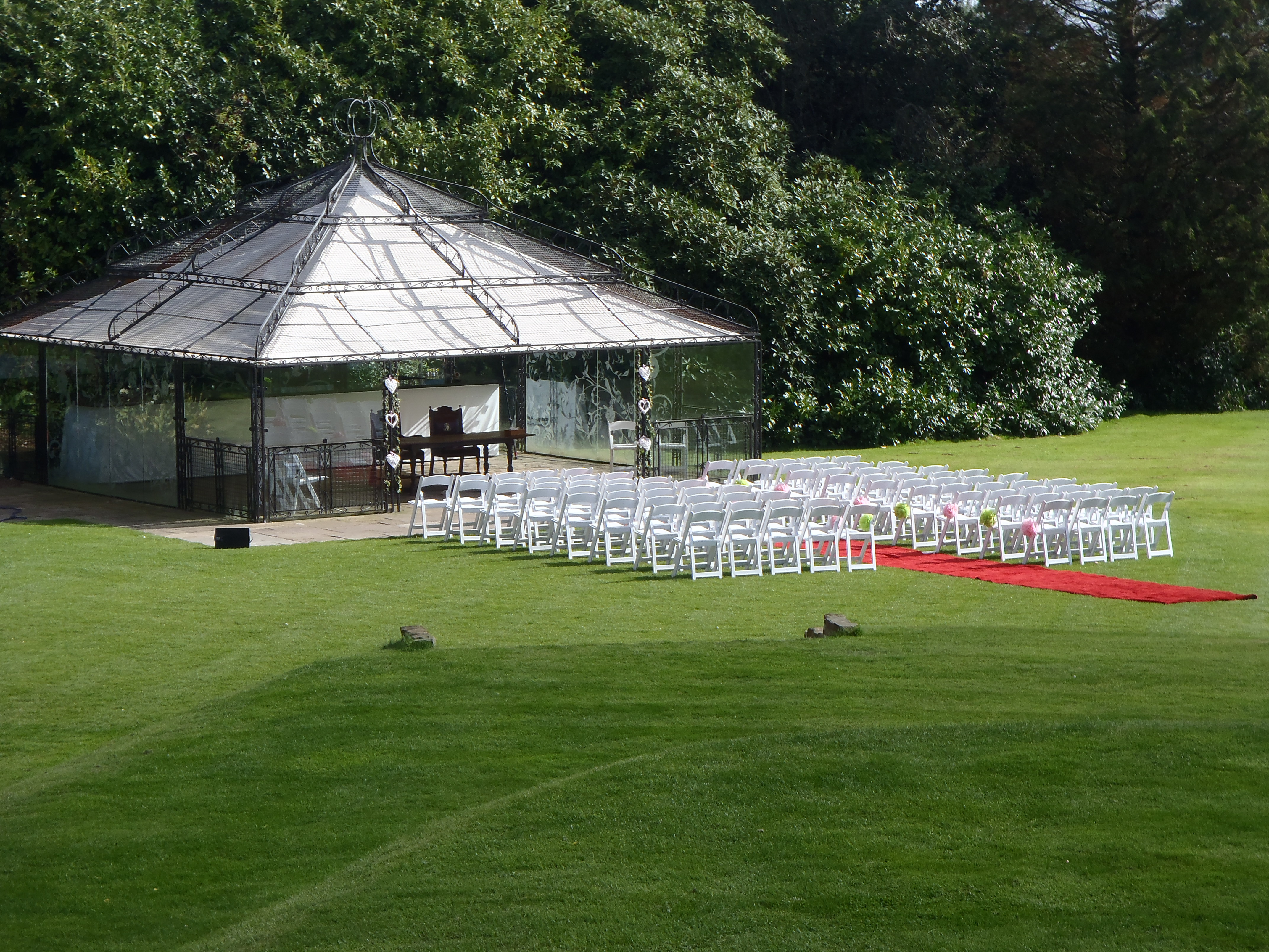 The ceremony was outside and it was thankfully a beautiful bright sunny September day, albeit a bit on the breezy side. We sat on rows of white chairs that were decorated with colourful pompoms, with a red carpet inbetween, leading to the stunning gazebo at the front. My friend looked the happiest I have ever seen him as he waited for his bride to appear. His suit was accented by a deep purple cravat and cummerbund, to correspond with the colour theme of the day.
