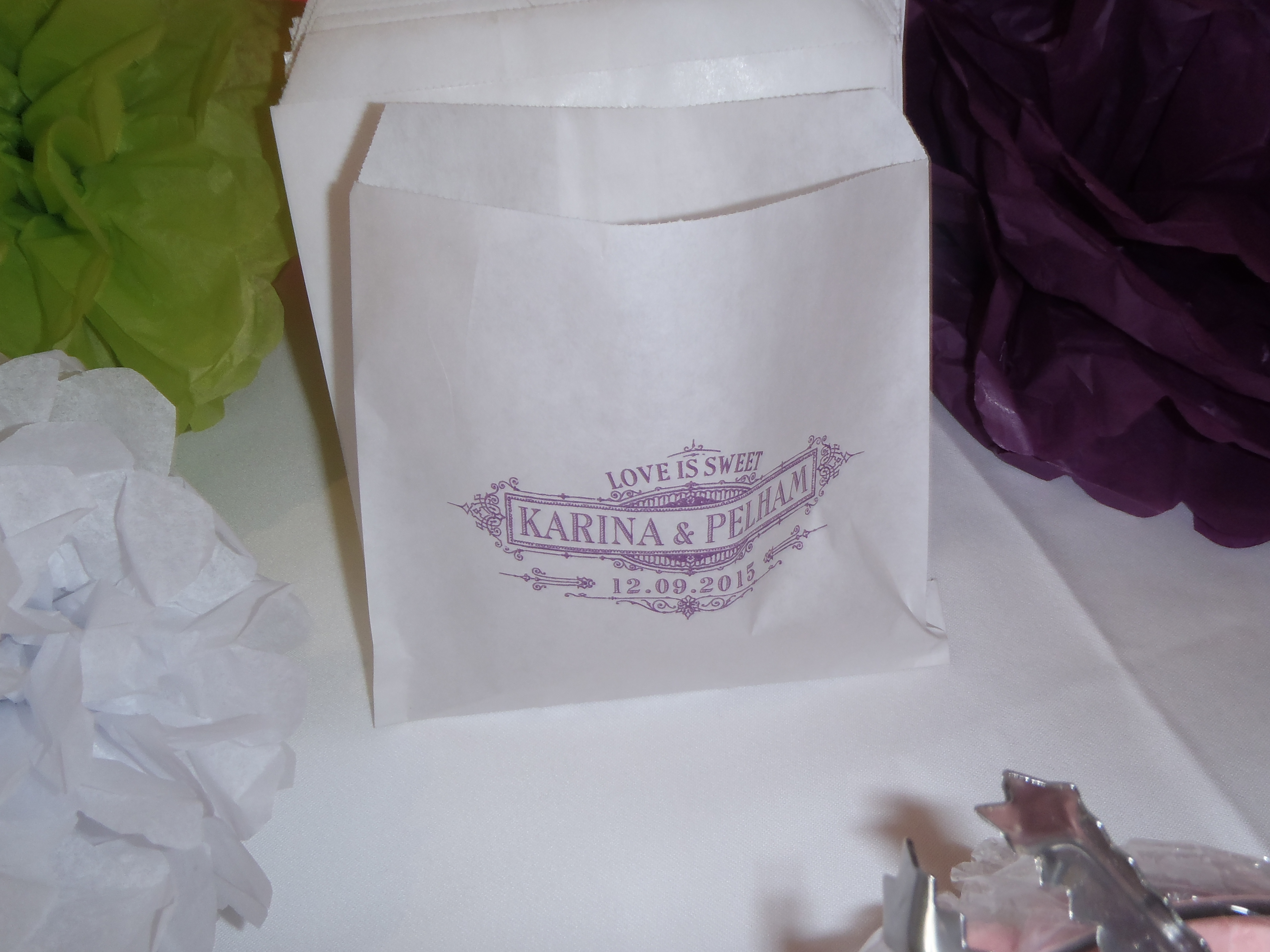 Following the meal, sweets were brought round with the tea and coffee including macaroons with the couples initials piped on the top. We then retired to the bar and games room whilst they cleared the tables to make way for the dance floor. There was a sweet table, with paper bags that were personalised with the couple’s names in purple text. We browsed the stunning pre wedding photo books – a custom of Asian weddings since the late 1990’s.