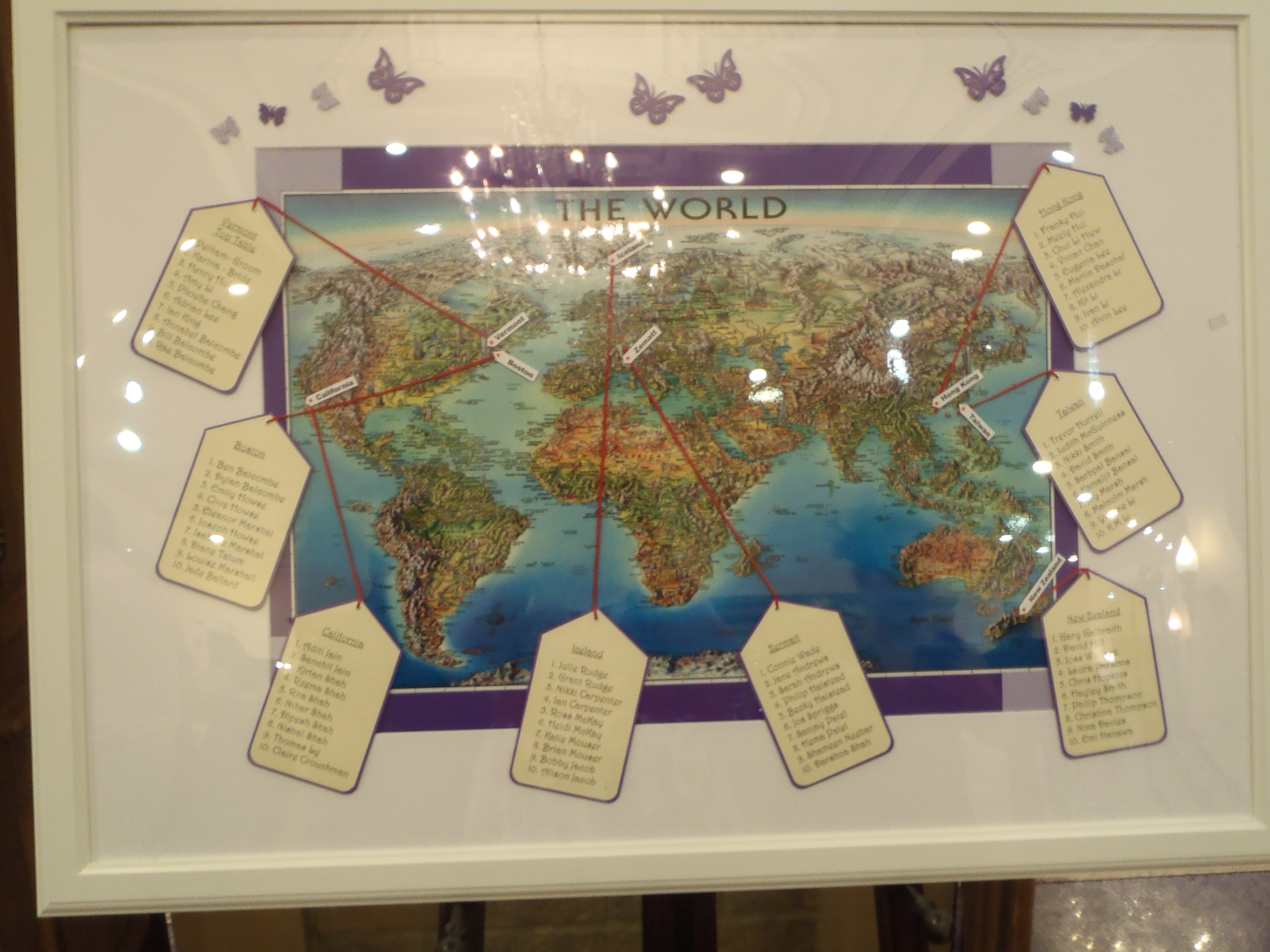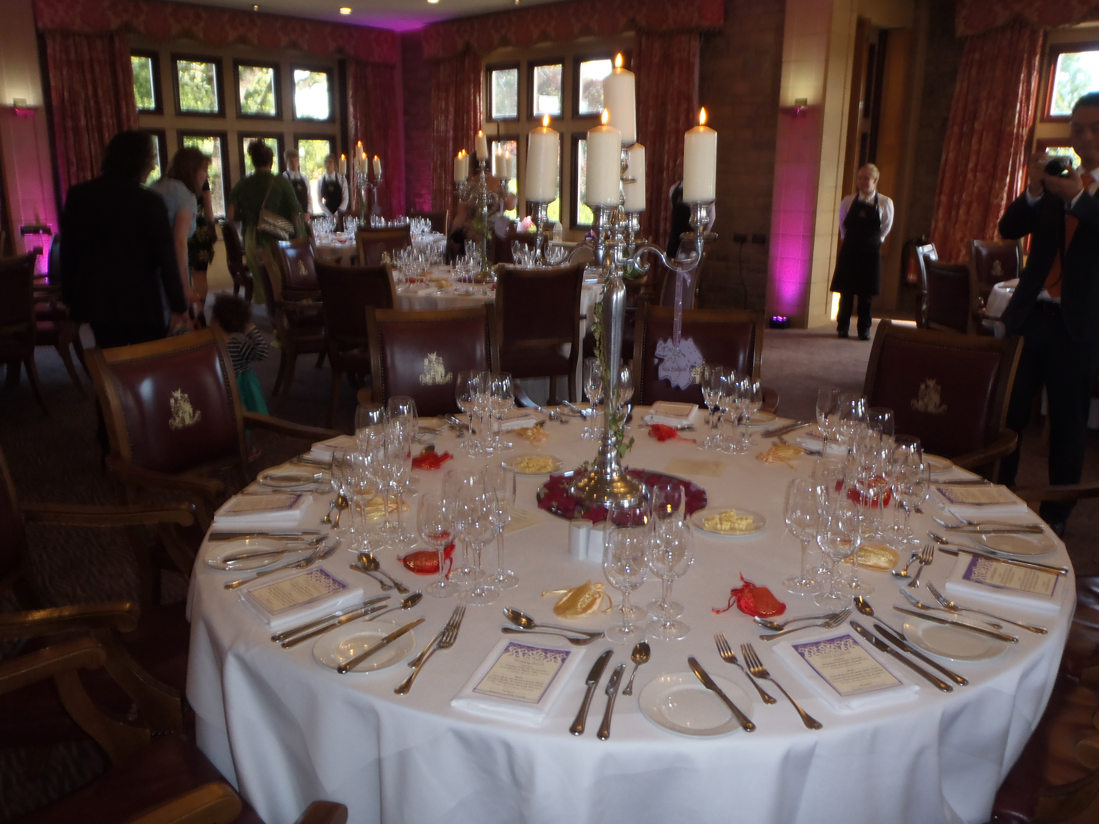 Soon we were welcomed by the toastmaster inside from the gardens, to find our name on the ornate table plan that was a world map, with the tables named after places the couple had visited. It was also decorated in purple and with butterflies – themes that ran through the whole day.  The travel theme was also incorporated in the guest book which had a watermark of world map on each page. We then entered a large medieval style room. Round tables were adorned with silver candelabra that had real candles and ivy wrapped around them. There was some debate on our table as to whether or not the candles were real but this soon became obvious when the wax started to drip down. The bride changed into a beautiful traditional gown for the meal, which her mother had worn for her wedding.