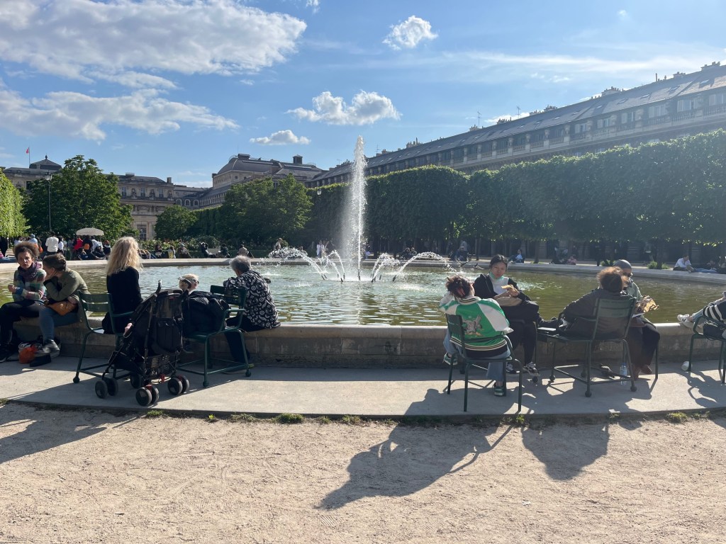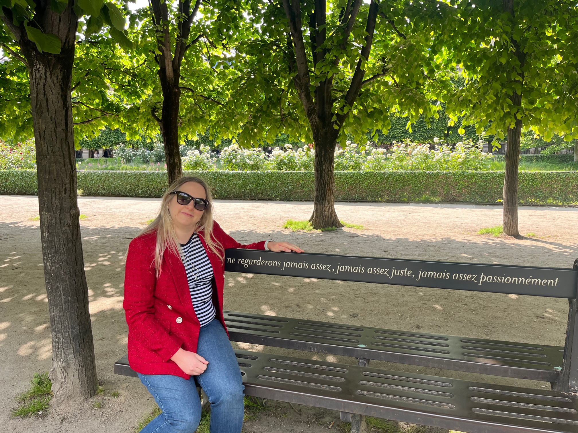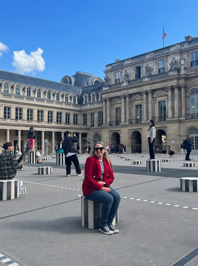 A quick stop was made at the Louvre so we could do the iconic finger on top of the pyramid shot, before it was back to Emily in Paris filming location hunting and we headed to the Palais Royal, a formal royal palace. The forecourt or Cour d’honneur, has striped pillars which look like sticks of rock and seem to be a prime location for influencers to pose. The Jardin du Palais Royal is a beautiful tree lined garden, where Emily has her lunch break in the first episode and meets her friend, Mindy. Many of the benches have quotes written on them from 20th century writers. The one I am sitting on translates as ‘we’ll never look enough, never fair enough, never passionate enough.’
